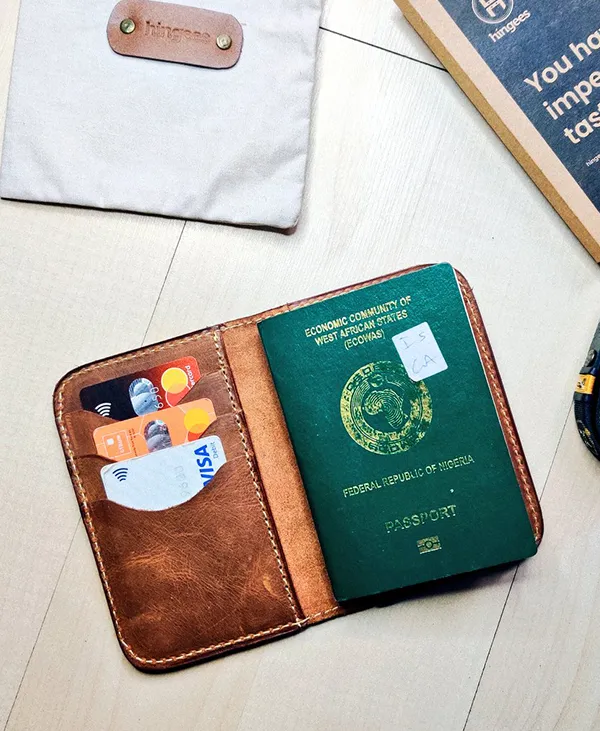 Handcrafted in the ancient city of Ile-Ife, Nigeria, the Hingees leather passport holder is the ultimate travel companion. This three-in-one accessory holds one passport, three cards, and bills.